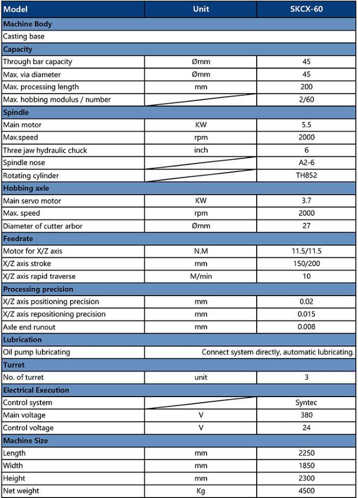 The SKCX-60 CNC Gear Hobbing Machine Tool can finish different production methods, such as: turning, milling, drilling, deburring and plunge-cutting etc by once clamping.