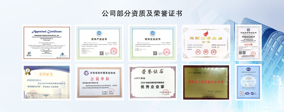 公司介紹COMPANY INTRODUCTION鄭州通達(dá)軟件有限公司(簡(jiǎn)稱:通達(dá)軟件 / 掛牌代碼:669353)坐落于“河南省國(guó)家大學(xué)科技園(東區(qū))”,鄭州通達(dá)軟件有限公司是一家專業(yè)從事軟件研發(fā)、生產(chǎn)、銷售、服務(wù)為一體的國(guó)家高新技術(shù)企業(yè),通過(guò)軟件CMMI3級(jí)認(rèn)證、國(guó)家科技型中小企業(yè)、雙軟企業(yè)、AAA企業(yè)等資質(zhì)認(rèn)證,公司與河南省教育廳、河南大學(xué)、河南科技大學(xué)、河南農(nóng)業(yè)大學(xué)、河南師范大學(xué)、華北水利水電大學(xué)等學(xué)校在技術(shù)研發(fā)及人才儲(chǔ)備進(jìn)行戰(zhàn)略合作。
