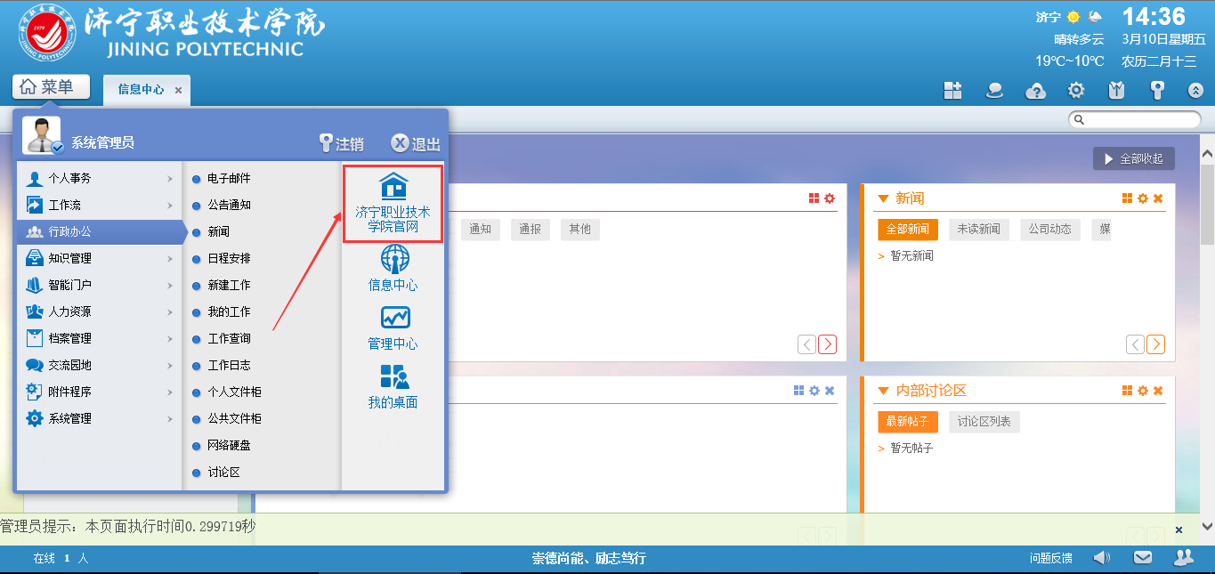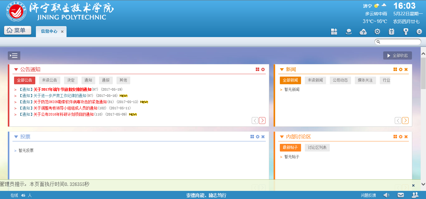 同樣可設(shè)置登錄首頁(yè)的界面,學(xué)校的理念校訓(xùn)和主要功能模塊菜單的動(dòng)態(tài)信息,所有的教職工登錄OA辦公系統(tǒng)后都可以及時(shí)的查看各種信息的更新動(dòng)態(tài)。