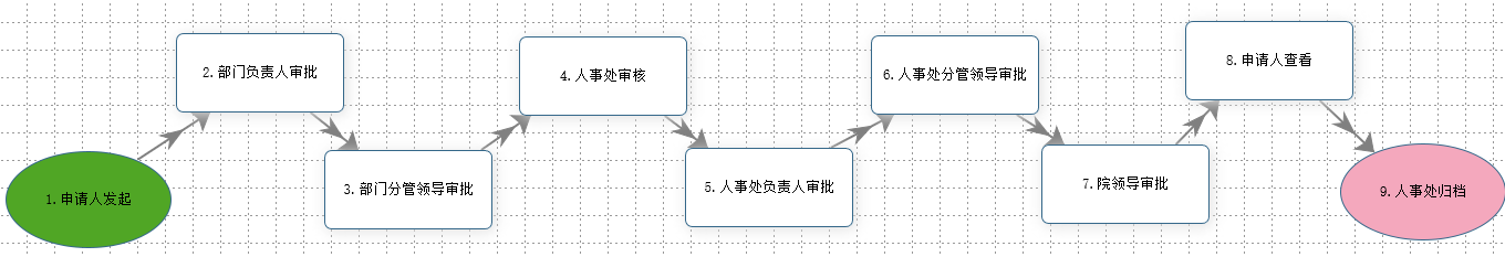 流程說(shuō)明:個(gè)人填寫(xiě)申請(qǐng)表→部門(mén)負(fù)責(zé)人審批→部門(mén)分管院領(lǐng)導(dǎo)審批→人事處審核人審核→人事處負(fù)責(zé)人審批→人事處分管院領(lǐng)導(dǎo)審批→申請(qǐng)人到人事處辦理相關(guān)手續(xù)(簽訂承諾書(shū))→申請(qǐng)表由人事處歸檔。