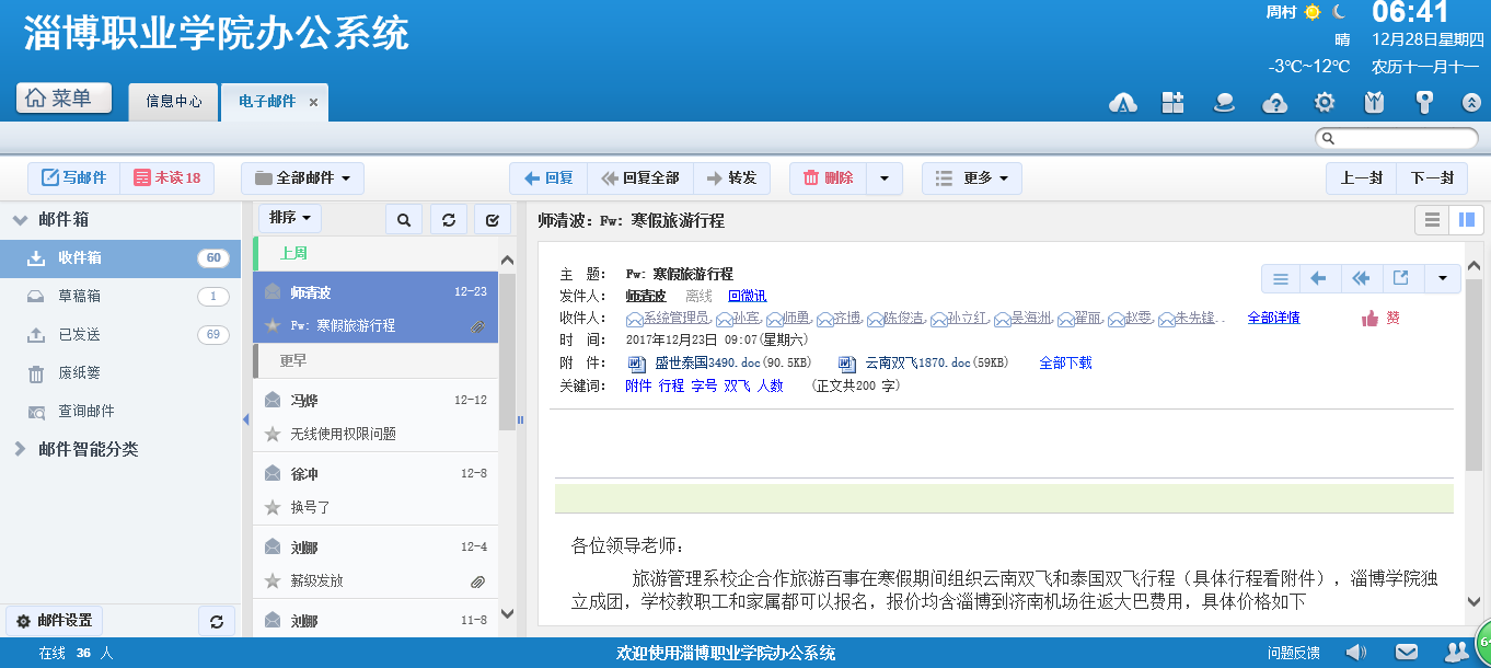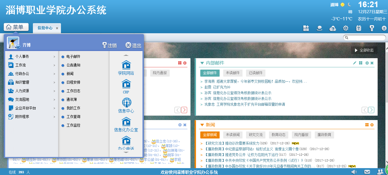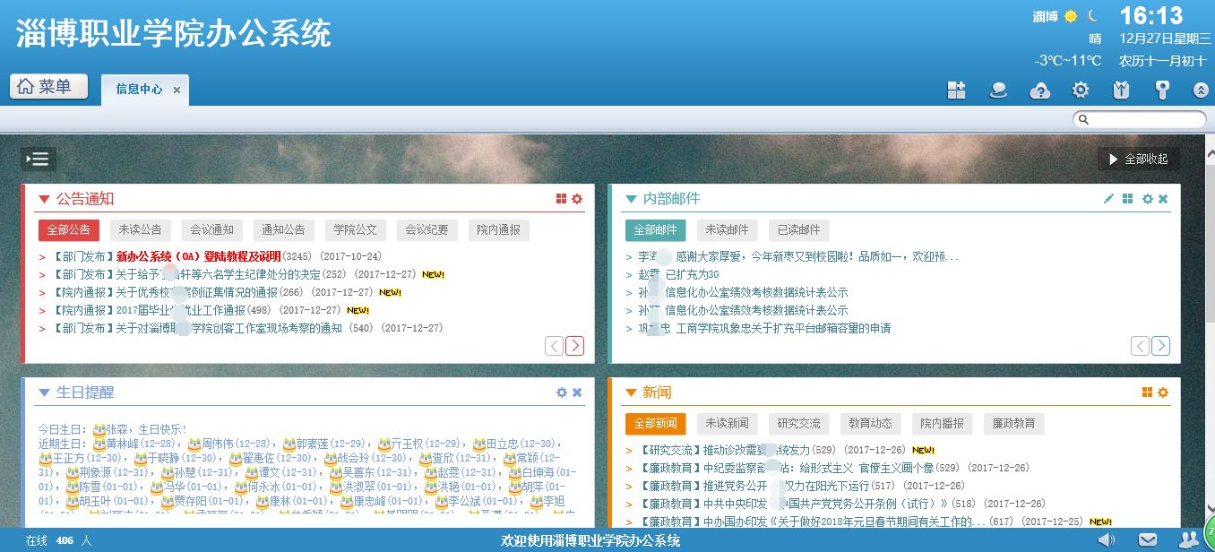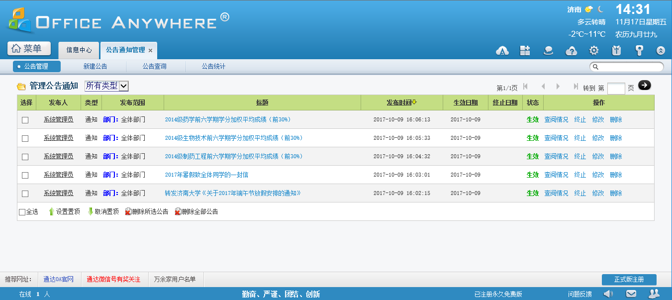 通達OA教育版2017年9月份正式升級至通達OA2017平臺鉆石版,并重新做了數(shù)據(jù)庫分離,大大優(yōu)化了OA系統(tǒng),訪問速度大大提高,完全可以滿足1500的并發(fā)量,在學(xué)校的大力推廣下全校教職工100%的利用率,功能模塊涉及到工作流、新聞、公告、文件柜、單點登錄、工資條、人力資源、辦公用品等。