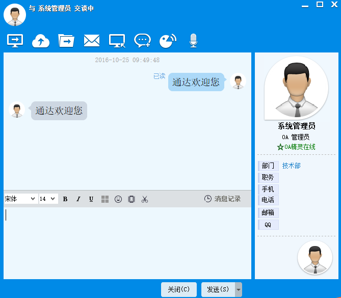 通達(dá)統(tǒng)一通訊提供以下功能:通過綁定用戶把客戶端、瀏覽器、移動設(shè)備、手機(jī)短信、郵箱等通信工具有效整合在一起,幫助企事業(yè)用戶加強(qiáng)內(nèi)部溝通,提高工作效率。即時通訊是很好的企事業(yè)員工溝通工具。為企業(yè)、教學(xué)辦公通信提供所需的即時消息、文件傳輸功能。OA精靈和企業(yè)、教學(xué)辦公系統(tǒng)無縫集成和整合在一起,通過即時通訊技術(shù)為企事業(yè)提供了公共信息、日常辦公信息查詢等信息實(shí)時推送事務(wù)提醒服務(wù),例如日程提醒、工作流提醒、郵件接收提醒、公告通知。