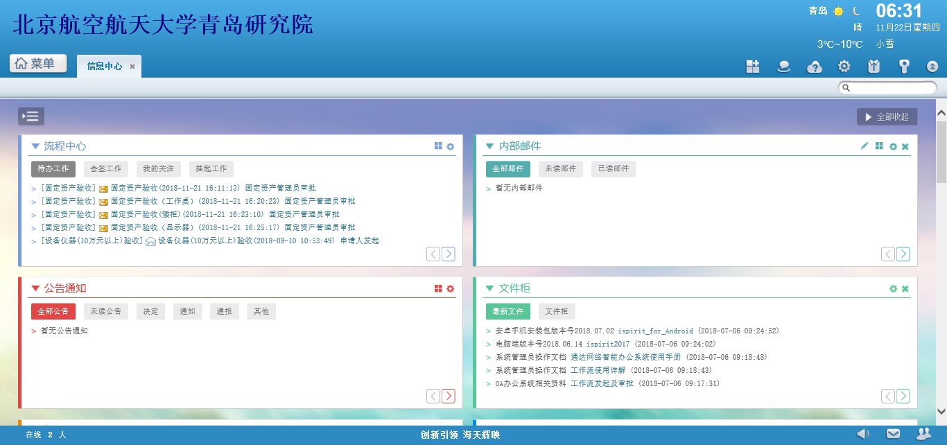 北航研究院是通過統(tǒng)一招標(biāo)的方式在眾多OA廠商中諸如泛微、致遠(yuǎn)等脫穎而出,毅然選擇了通達(dá)OA系統(tǒng),在使用過程中,通達(dá)OA可完全按照用戶的實(shí)際需求定制設(shè)計,符合研究院的經(jīng)營和辦公情況,達(dá)到無紙化辦公、網(wǎng)上審批流程、移動辦公、移動考勤、發(fā)布通知公告、辦公用品管理等,順應(yīng)當(dāng)下大環(huán)境和以后發(fā)展規(guī)劃,綜合以上因素,公司于2018年8月份開始在院范圍推行通達(dá)OA。