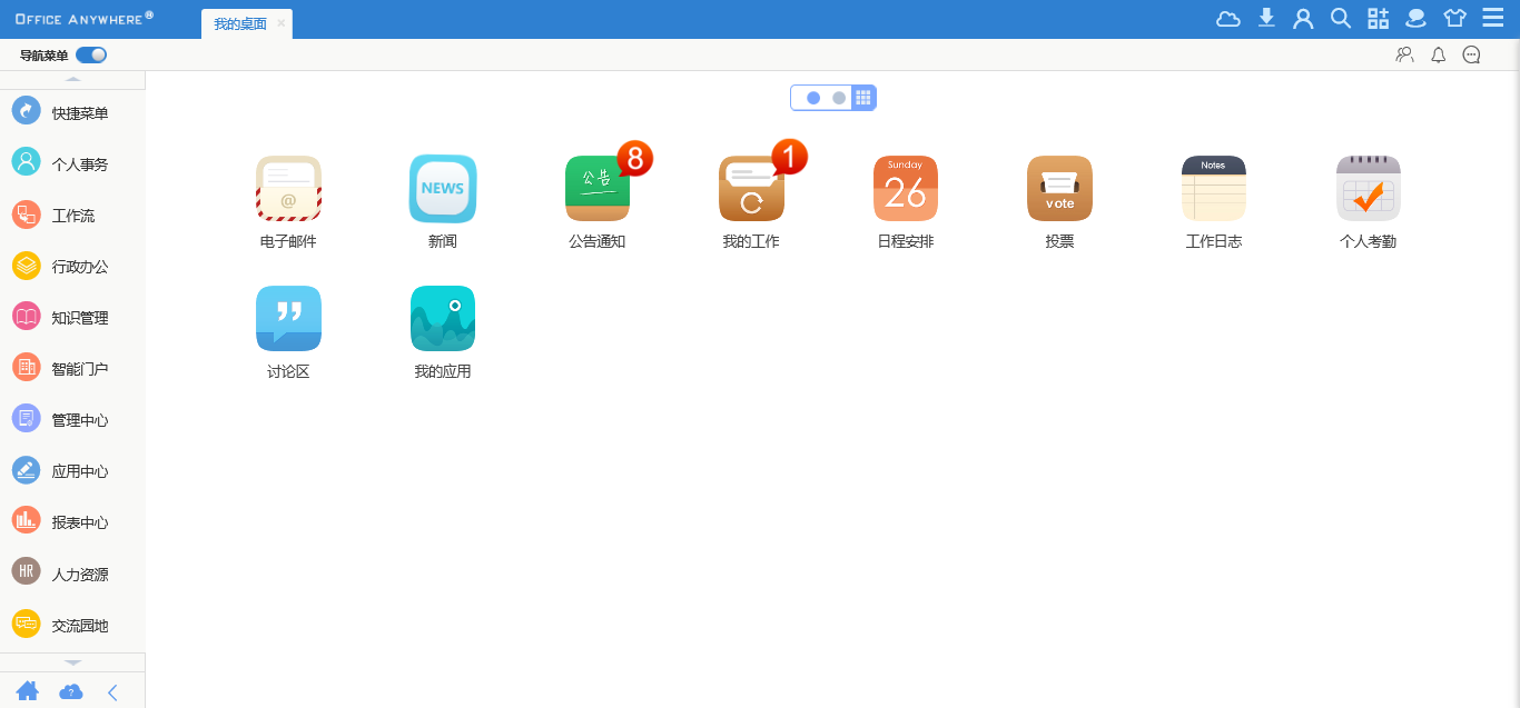 支持一鍵拖拽,將自己經(jīng)常用到的信息可以拖動(dòng)到頂部顯示,以便方便快捷的找到自己想要的信息。比如電子郵件、公告通知、新聞、工作流等模塊。
