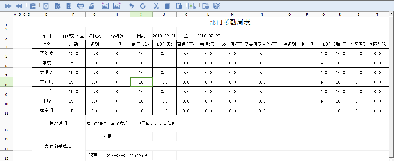 5.考勤審批 客戶要求,每周由部門經(jīng)理進(jìn)行一周的考勤審批,并且可以手動填寫本部門員工的補(bǔ)加班、消遲到、消早退、消曠工。