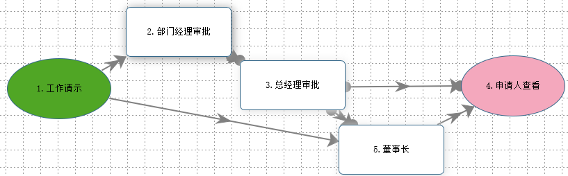 該流程實(shí)現(xiàn)員工向高層發(fā)起的工作的匯報(bào)流程,依次向部門經(jīng)理、總經(jīng)理、董事長(zhǎng)匯報(bào)工作。
