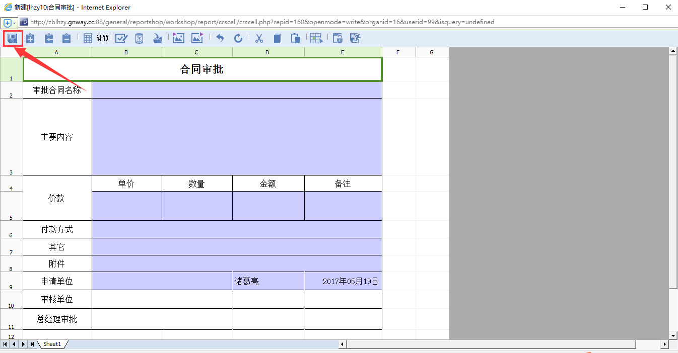 (2)將深藍(lán)色可填寫部分,根據(jù)實(shí)際情況填寫完整后點(diǎn)擊左上角的保存按鈕進(jìn)行流程的轉(zhuǎn)交: