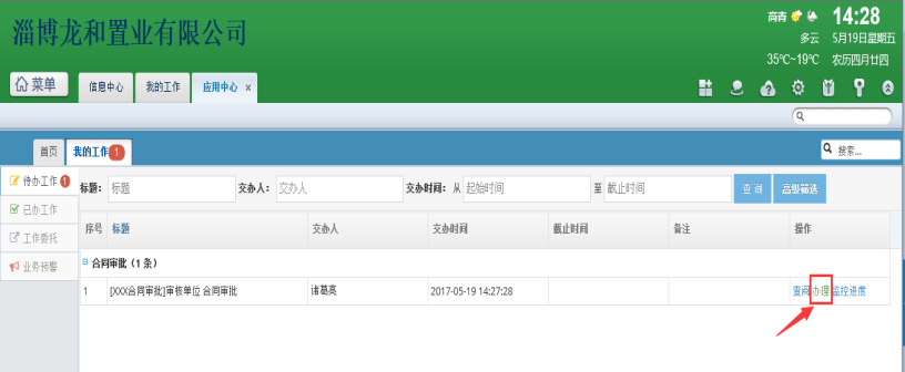 (4)領(lǐng)導(dǎo)登錄OA之后,同樣會(huì)收到提醒,也可以在應(yīng)用自建平臺(tái)-應(yīng)用中心我的工作中會(huì)看到待辦的工作,點(diǎn)擊辦理即可。