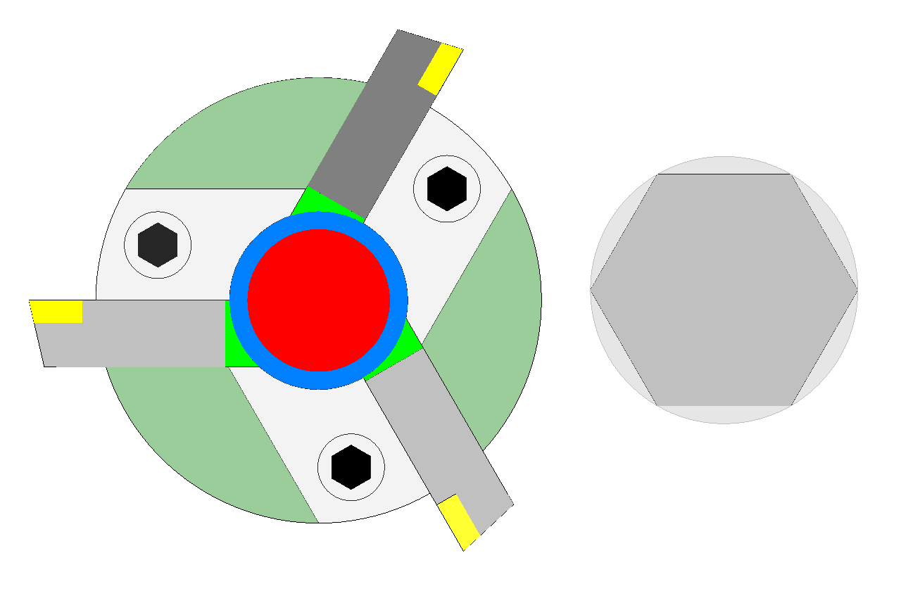 下面是一張車方機利用飛刀盤加工六方工件的原理圖,動力頭帶動飛刀盤與工件保持2:1的轉速,這樣六方的六個面就一次成型了。很多用戶擔心這種加工方式刀片的磨損情況。我司在車方機的研發生產上已經有多年的經驗,在刀片的使用及注意事項上也有很深的研究,刀片需要根據材質選擇適當的車刀,當然材質越好的刀片磨損越慢,這就需要對工件進行綜合考量,選擇最具性價比的刀片。在切削液的選擇上很多用戶陷入了誤區,這種斷續切削如果用普通的水基切削液,會大大減少刀具的使用壽命。斷續切削最宜使用的切削液是油基的,這也是我們總結出來的經驗。
