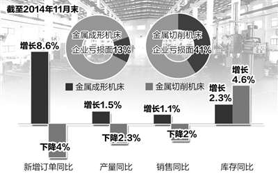截至2014年11月,中國機床工具工業協會重點聯系的企業新增訂單同比下降1.7%,機床產量同比下降2.1%,銷售收入下降1.5%,庫存同比增加4.3%,機床企業虧損面達到36%。